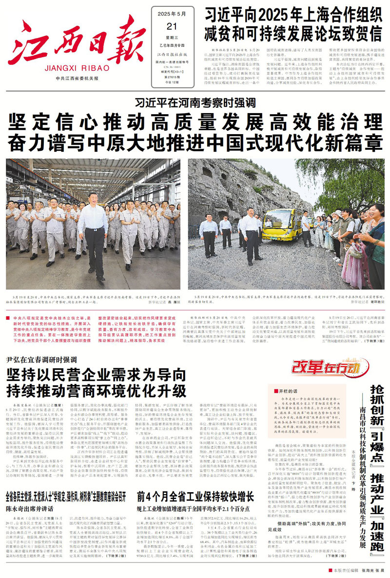 5月20日,民营经济促进法正式施行。当日,省委书记尹弘深入宜春,专题调研优化营商环境促进民营经济发展工作。他强调,要深入学习贯彻习近平总书记关于优化营商环境和民营经济发展的重要论述,坚持以民营企业需求为导向,聚焦突出问题,补齐短板弱项,提升服务质效,持续推动营商环境优化升级,促进全省民营经济持续、健康、高质量发展。